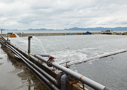 | 海産物は「相場」が大切で、当社は山口県に良質な浜を保有しています。相場が安い時に仕入れて、良質な浜で活きたままあさりを貯蔵。これこそが品質のよいはまぐりを安くお届けできるヒミツなのです。 |